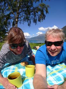 Schließlich gelangen wir bei Brimnes wieder auf die E13. In Klinsarvik genehmigen wir uns ein Picknick am Ufer des Hardangerfjords. Das Wetter läd gerade dazu ein.