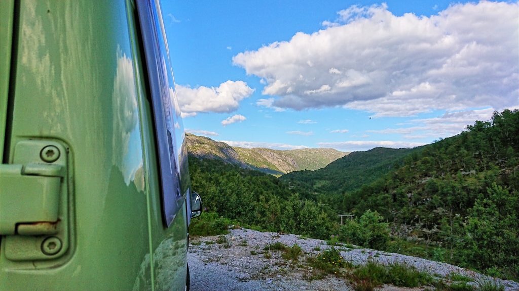 Bei Horda biegen wir auf die E134 ab. Die führt uns wieder rauf auf die Hochebene._