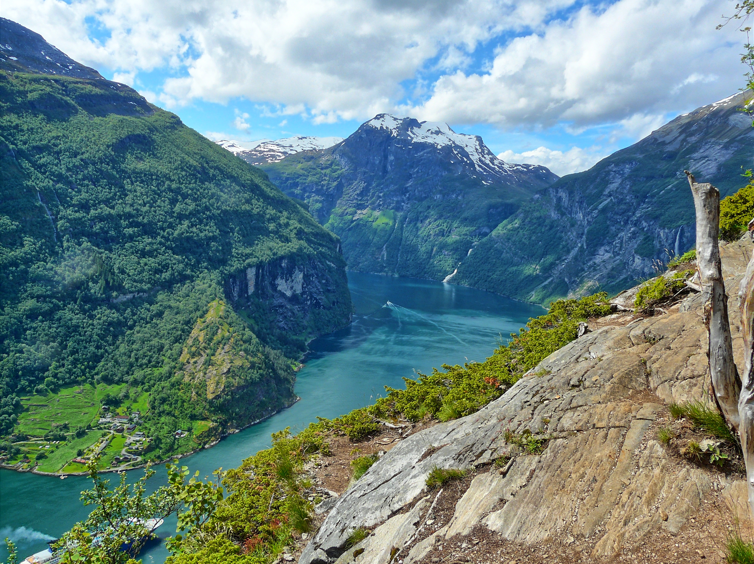 In Geiranger angekommen, ergreifen wir erst mal die Flucht (ziemlich viele Touris, wie wir halt auch), parken beim Fjordinfozentrum und wandern auf einen Aussichtspunkt hoch über den Fjord. Shoes say YES! Wenigstens etwas, 1,5 Stunden Gehzeit!
