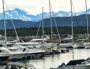 Da heißt für uns, erst einmal zurück von der Insel Runde (das ist ja bereits der erste Teil der Abenteuerstraße (siehe 10. Juni ) zunächst über die 61 (mit Fähre zwischen Hareid und Sulesund) auf die E39. Dann geht es – breit und gut ausgebaut – eben auf dieser E39 weiter (wieder mit der Fähre) bis Molde. Kaffeepause dort mit Blick auf den Hafen.