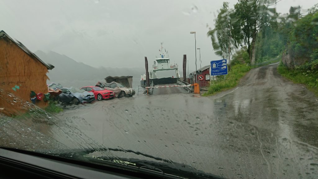 Am Morgen war jedenfalls Regen angesagt. Wir beschlossen, die Küstenstraße 680 nicht weiter zu fahren, sondern auf dem kürzesten Weg auf die E39 zu gelangen – nämlich per Fähre von Arasvika nach Hennset über den Korsnesfjord. Wartezeit: eine halbe Stunde im Regen:
