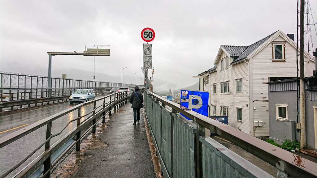 Dann gehen wir von dort aus zu Fuß über die Tromsøbru Richtung Innenstadt. Das ist bei diesem Wetter auch schon ein Erlebnis. Die Wasserfontänen, die Busse und LKW erzeugen kommen waagerecht.