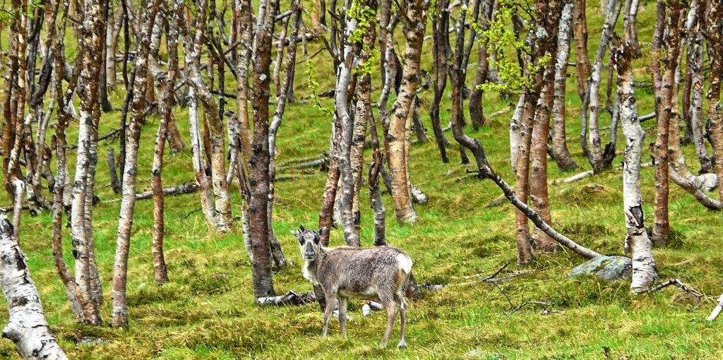 1. Highlight: Rentiere! Kleine Herden verbergen sich neben der Straße im niedrigen Birkenwald. Ein einzelnes erkennbar vor die Linse zu bekommen ist gar nicht so einfach.Dieses hier hat uns jedoch zugezwinkert und gemeint: ja, seit’s denn auch endlich da 🙂