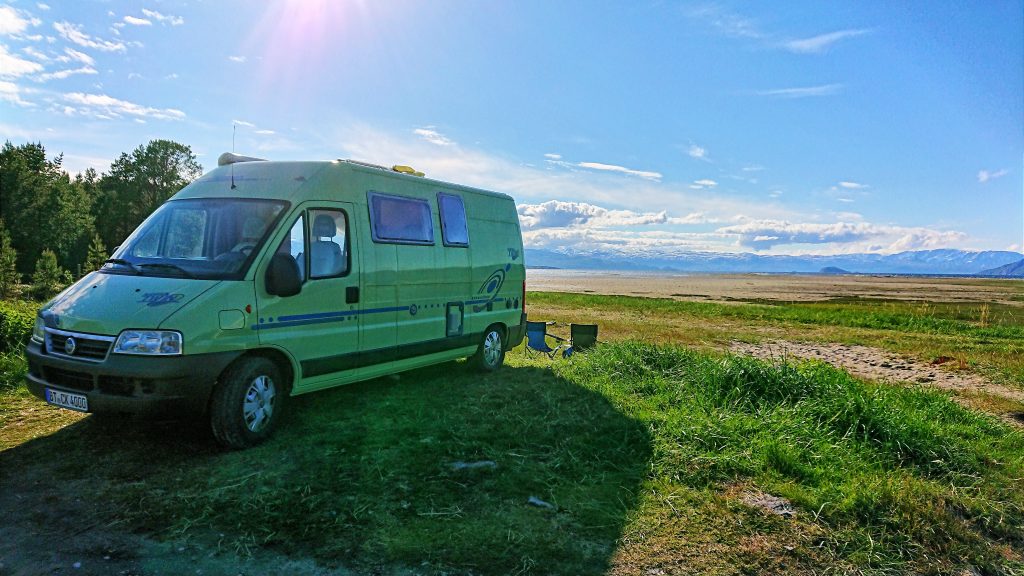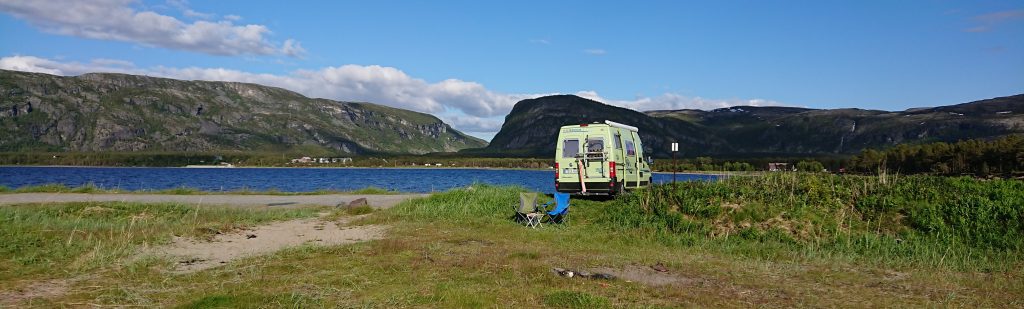Wir wählen einen Stellplatz am Badestrand ca. 7 km außerhalb von Alta und stehen wirklich in traumhaft schöner Umgebung direkt am Fjord_