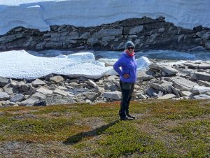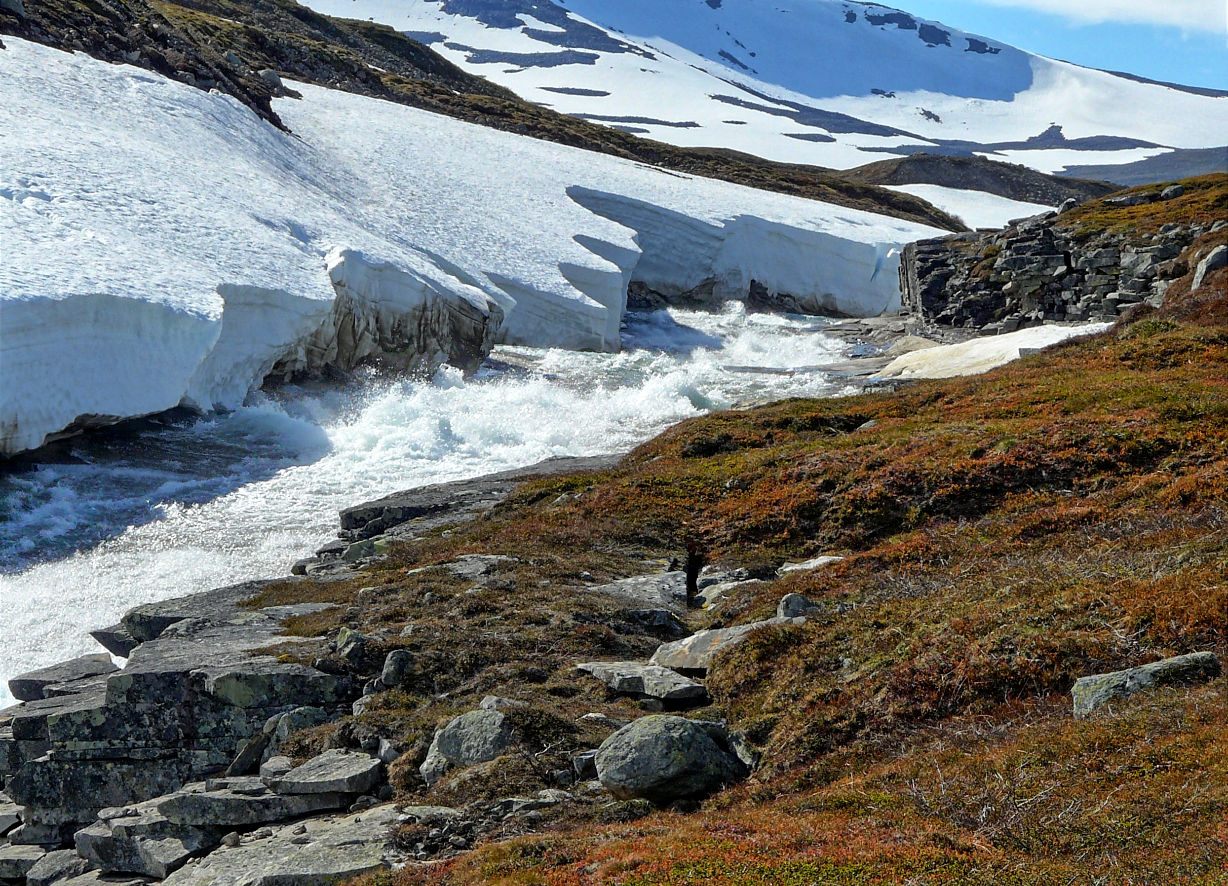 Auch dort unternehmen wir eine kleine Tour im Saltfjellet Nationalpark bis hinauf zu einem großen Schneefeld (oder doch Gletscher?) mit zugehörigem Rauschebach.