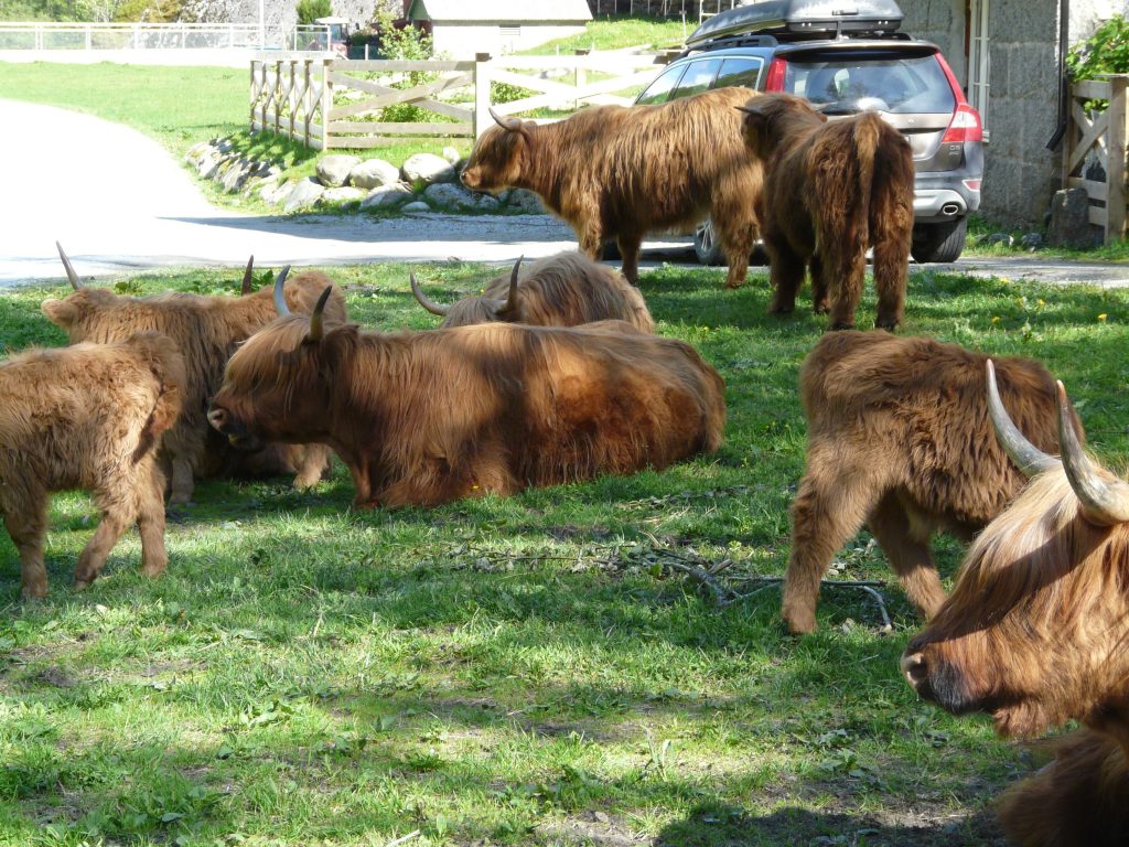 Eingeduscht gab es erst mal Kaffee im Basislager, dann sagten wir servus zu den Rindviechern vor Ort 🙂 – Bild ist vom Vortag, daher der Sonnenschein –