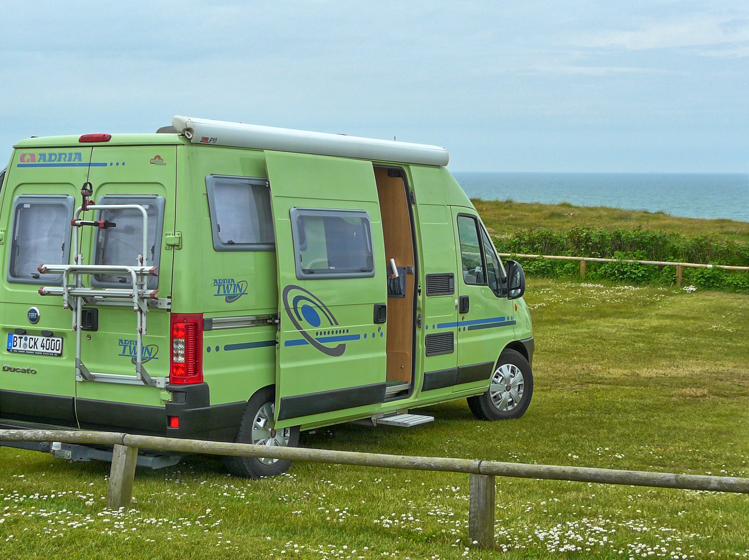 Der Stellplatz (gut gefüllt, aber erträglich) mit Blick auf die Nordsee, der Strand unmittelbar vor uns.