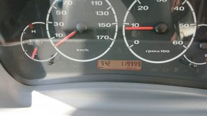 Der Tacho zeigt 9:42 Uhr und 119.999 km an. – Prima, dann können wir uns die gefahrenen Gesamtkilometer leicht errechnen 🙂