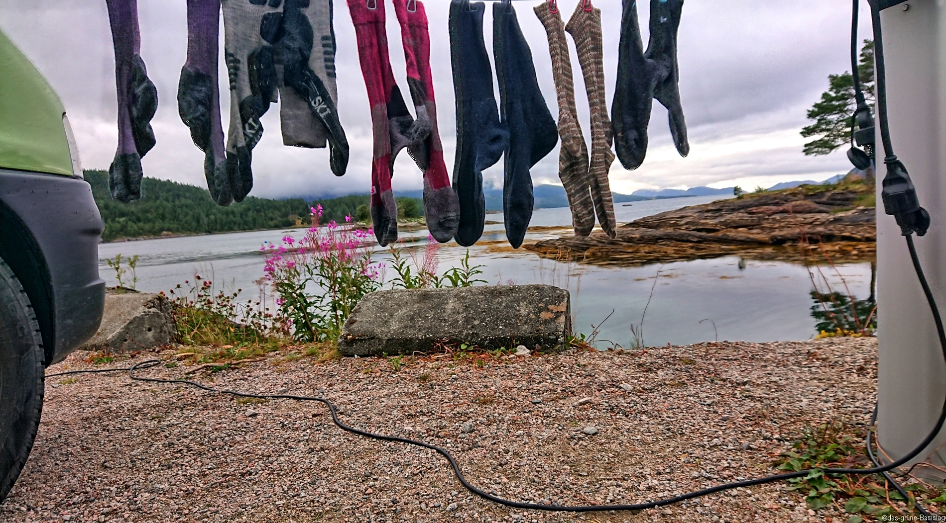 Wir machen Waschtag – bei uns und dem Basislager! Da hängen sie nun die Wandersocken, wie die Stockfische. Nur so stinken tun sie nicht mehr 🙂