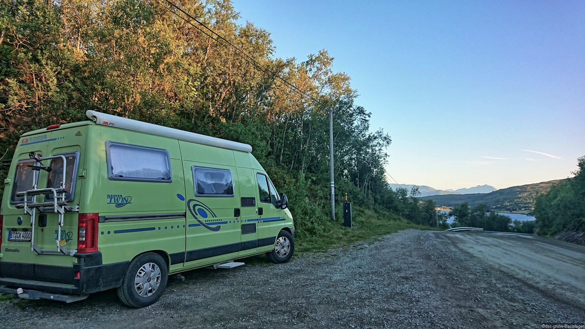 Kurze Brotzeit im Abstieg und Beratung, wie es weitergeht. Wir wollen in den Ånderdalen-Nationalpark und dort eine Flachetappe laufen. Die Fahrt dorthin geht noch mal die schöne Küstenstraße entlang. Aus dem Besuch im Park wird erst mal nichts, mangels Stellplatzmöglichkeit.