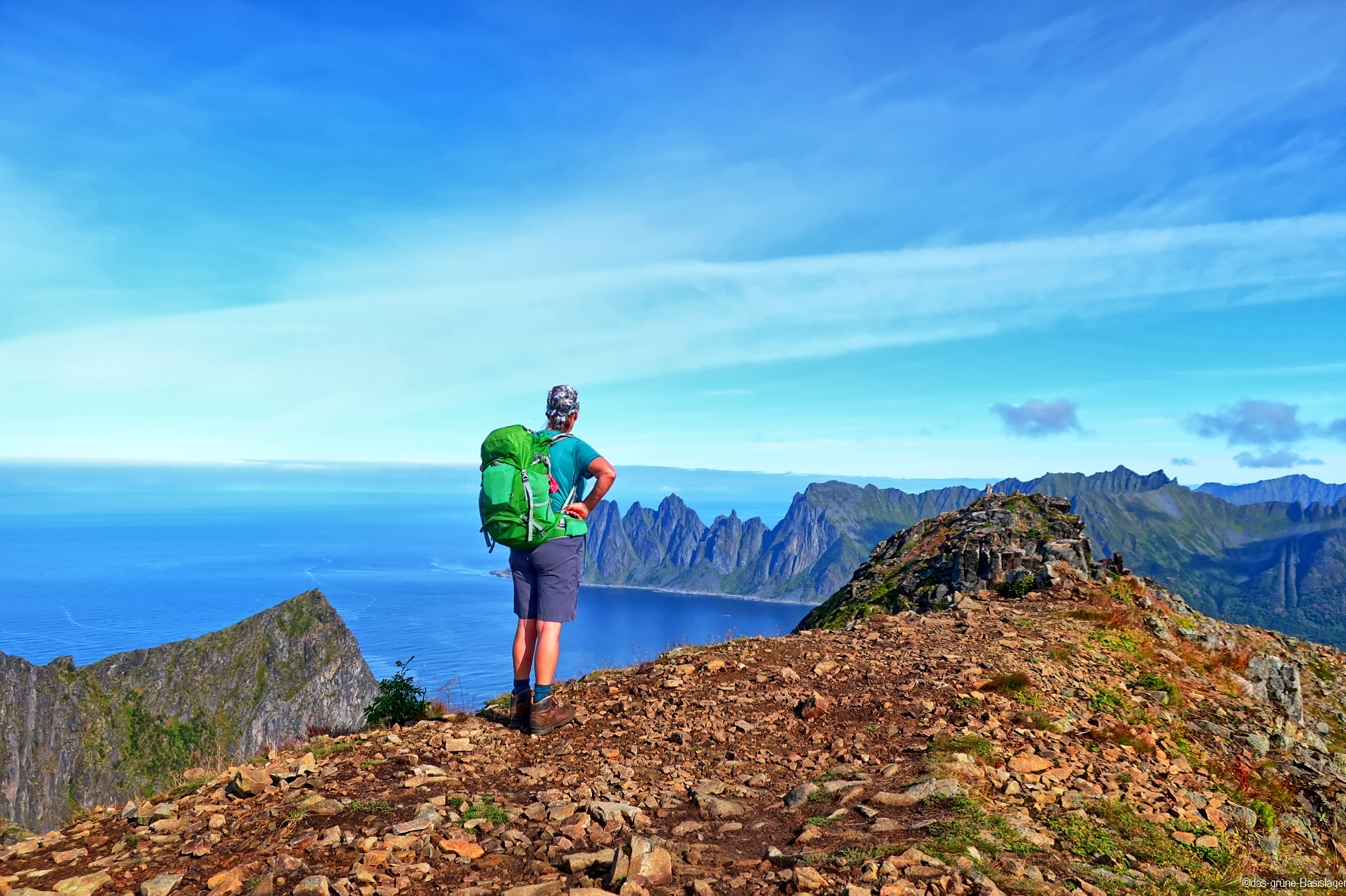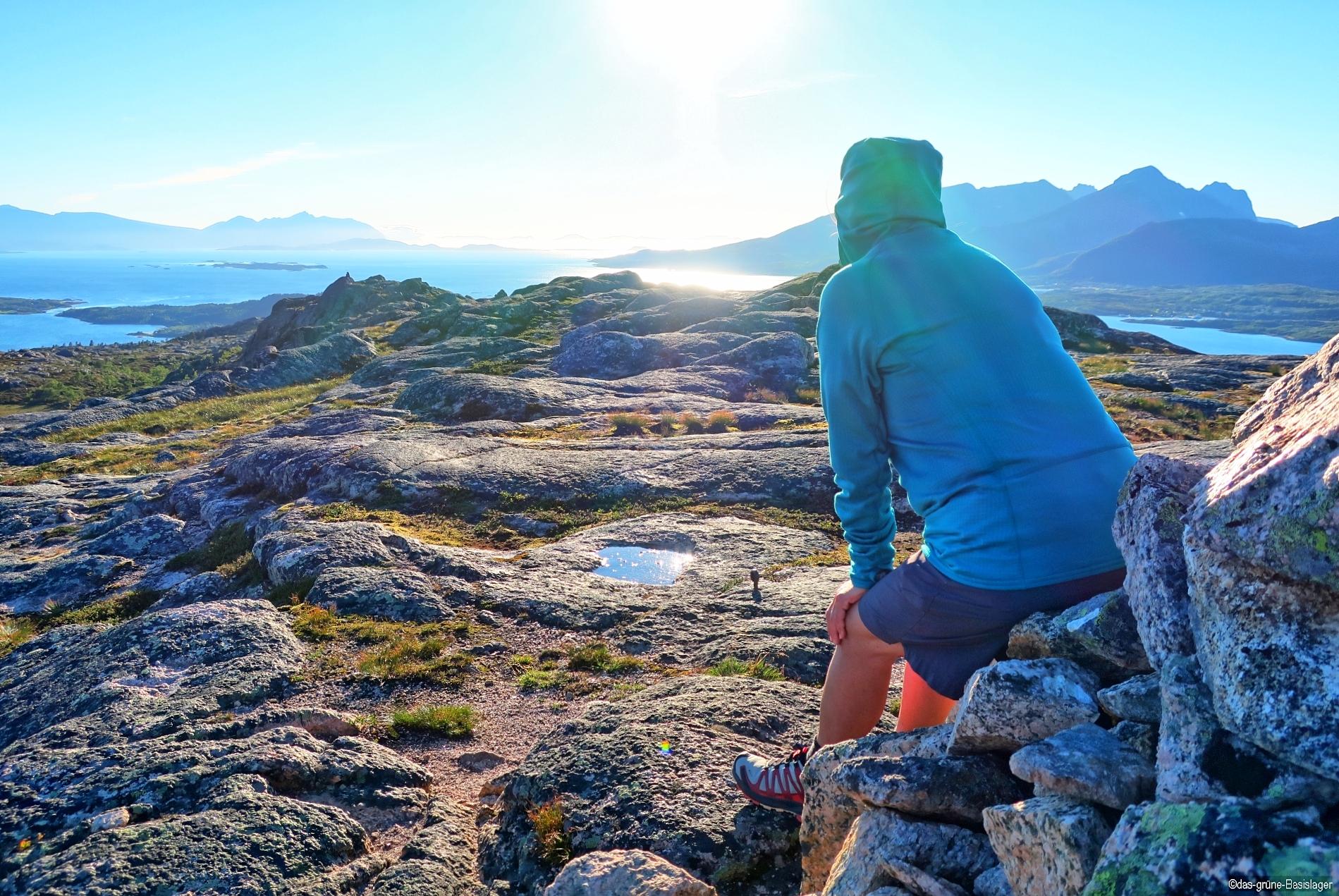 War so nicht geplant, ist aber passiert. Heute erreichen wir gleich zwei großartige Aussichtspunkte bei strahlendem Sonnenschein. Die erste Tour führt und auf dem Husfjellet, der wohl der Hausberg des Örtchens Skaland ist, wo wir unseren Stellplatz hatten. Es geht unschwer hinauf, die Aussicht links und rechts der Route in die Fjorde hinunter ist imposant.