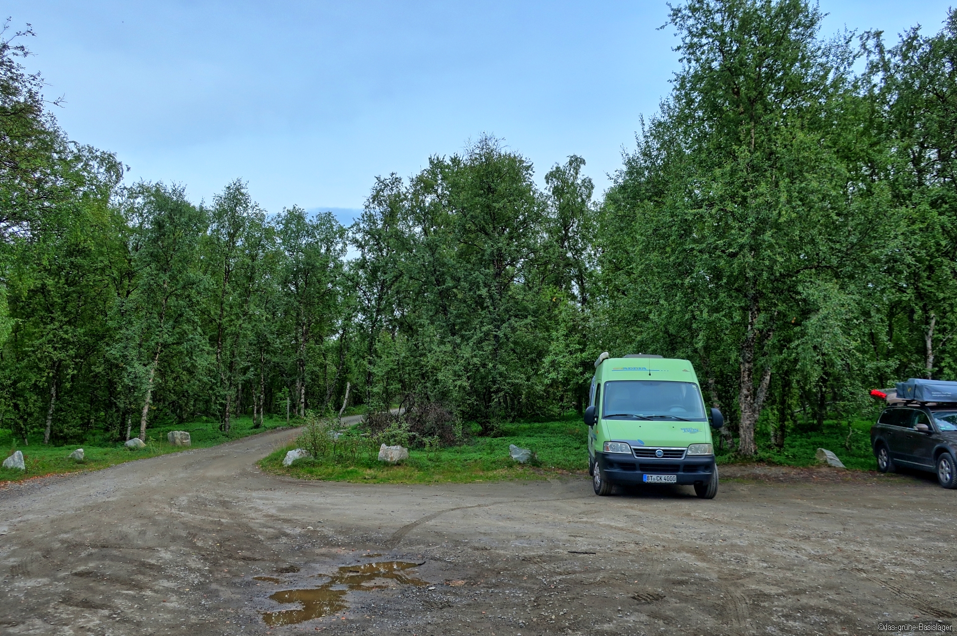 Wir fahren auf der E6 bis Storslett und übernachten auf einen Parkplatz in der Nähe des Badestrandes. Damit haben wir morgen die Option in den Reisa-Nationalpark zu fahren.