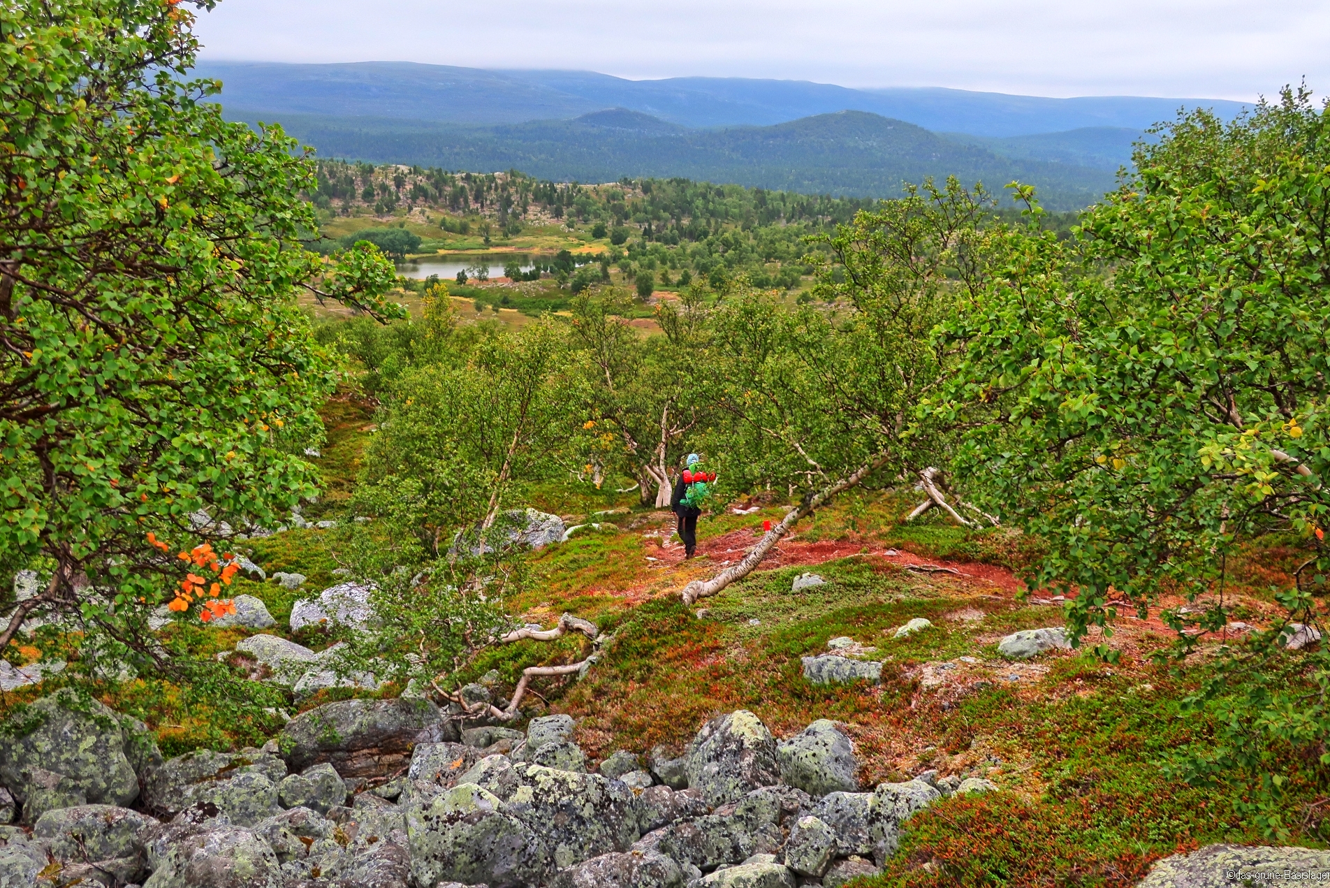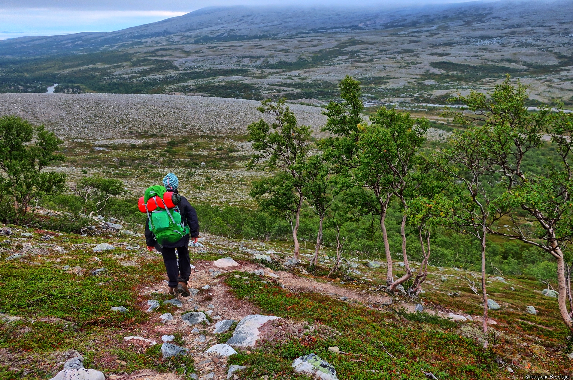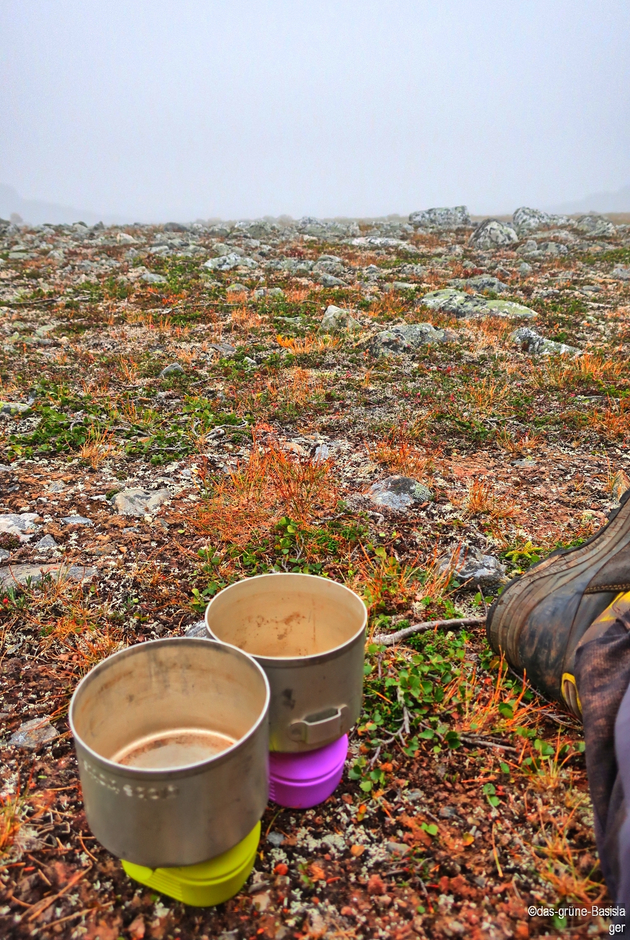 Während der Nacht hat sich Nebel über die Gipfelkuppe mitsamt unseres Höhenlagers gelegt. Man sieht gerade bis zum nächsten Steinmännchen. Trotzdem: wir hatten gestern das Szenario so aufgenommen, dass uns das beim kargen Frühstück nicht weiter stört. Das Lager ist schnell wieder in den Rucksäcken verstaut und dann geht es auch schon an den Abstieg. Vorerst ins graue Nichts, bis sich dann der Nebel lichtet.