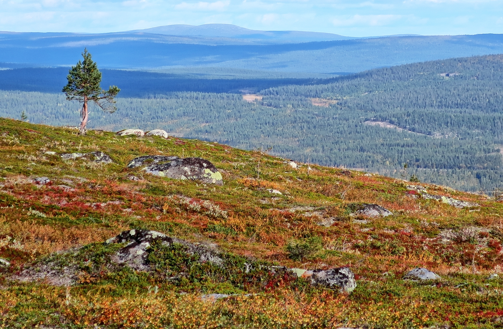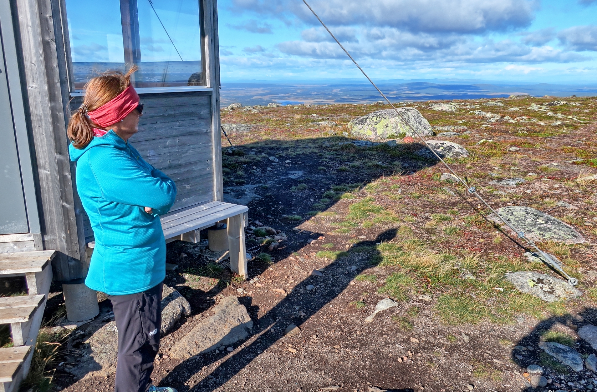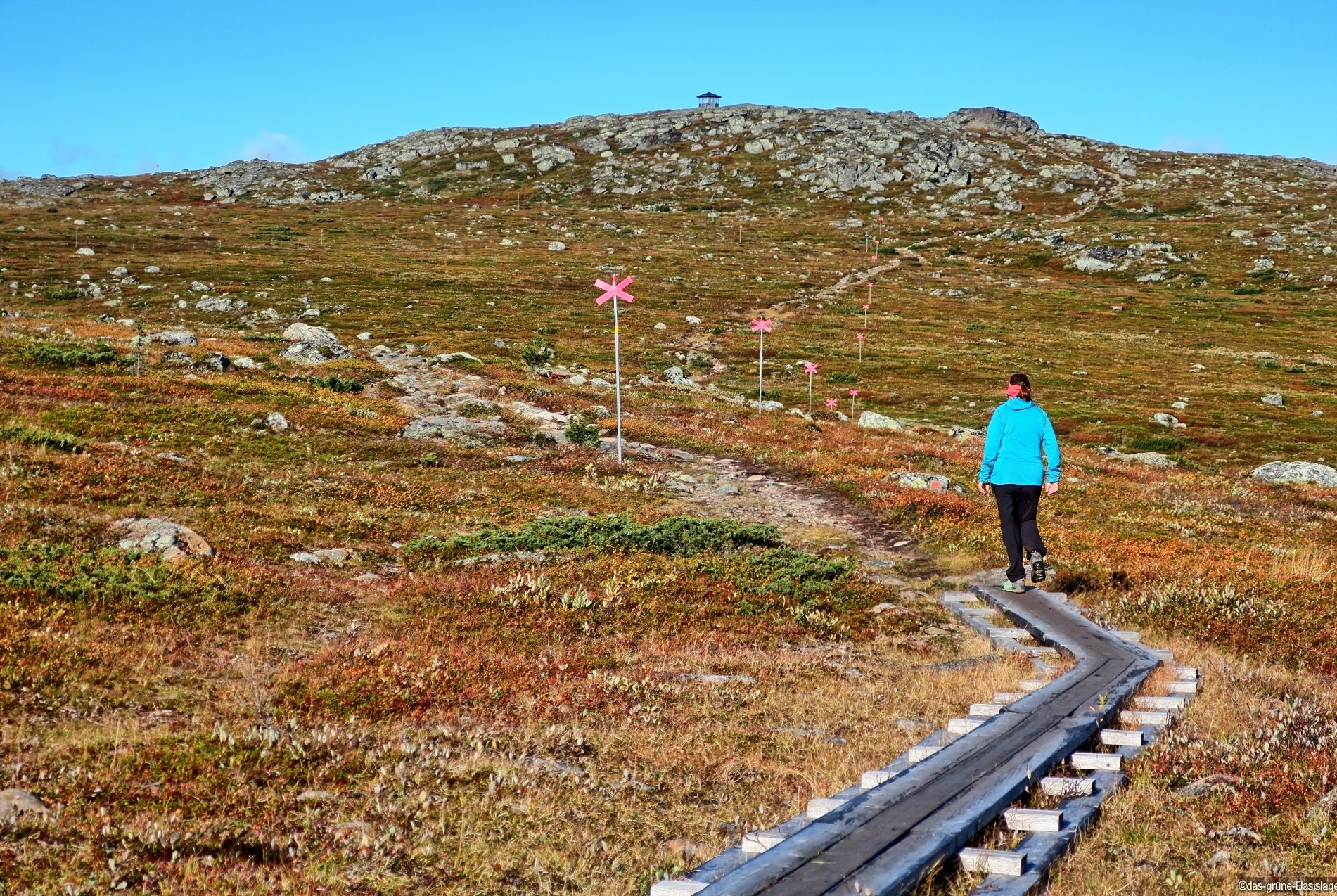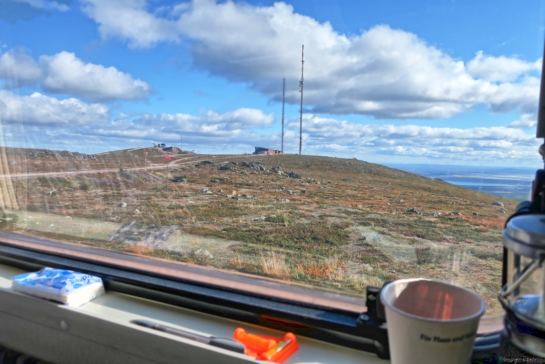 Der Tag beginnt, wie der gestrige aufgehört hat: mit einem Sonne-Wolken-Mix. Gestern hatten wir bei unserer “Regenrunde” zwischenzeitlich die Straße überquert, die ganz hoch zum Sendemast bzw. der Bergstation der Seilbahn führt. Und die ist öffentlich befahrbar. Da fahren wir hoch, bis der Wanderweg zum Västtoppen kreuzt. Und dann geht es die nur noch 2,5 km noch mal hoch zum Pavillon. Bei Sonnenschein!e