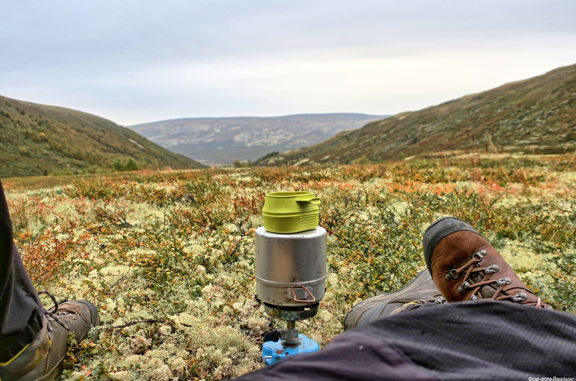 Das Basislager empfängt uns mit der Nachricht, dass die Gasflasche gewechselt werden muss 🙂 Ist nun erledigt, genauso, wie das Verstauen der Ausrüstung und Käffchen. Dann geht es auf der E6 weiter nach Dombås zum Einkaufen. Die E6 führt uns nach Kvam. Von dort aus geht es noch 12 km ins Kvamfjellet, wo wir auf einem Wanderparkplatz stehen.