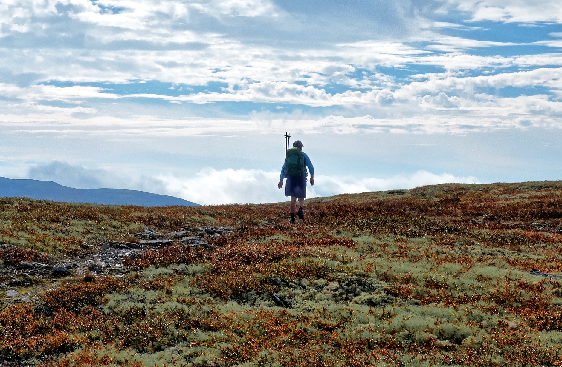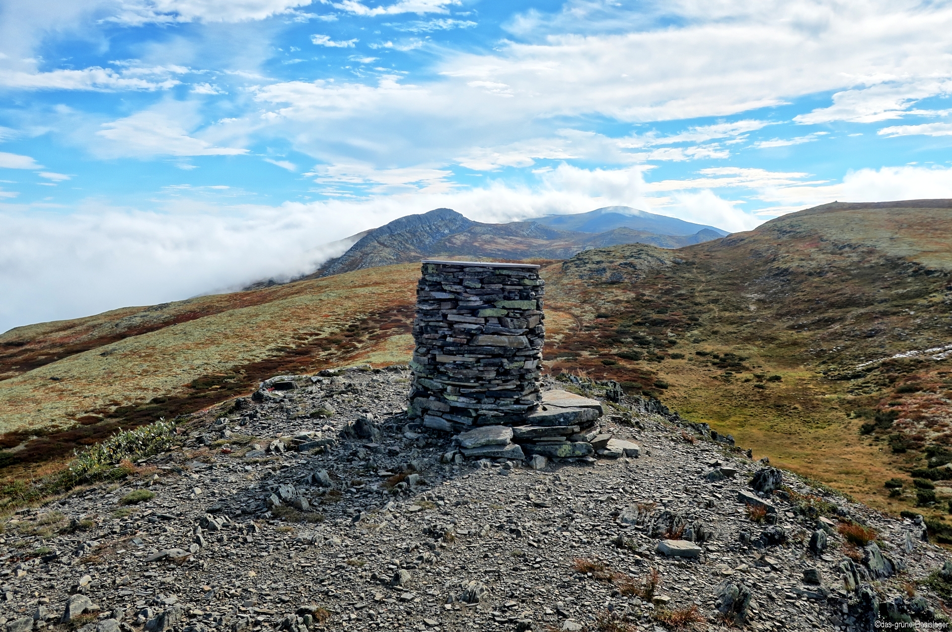 Die Nebelschwaden hängen unten drin. Die Achse Sukkertoppen – Tjønnsæterfjellet ist jedoch frei Hintergrundbild: rechts, der mit der kleinen Spitze ist der Middagshaugen – ganz hinten mit der Nebelschwade der Tjønnsæterfjellet. Der Weg dorthin ist klasse.