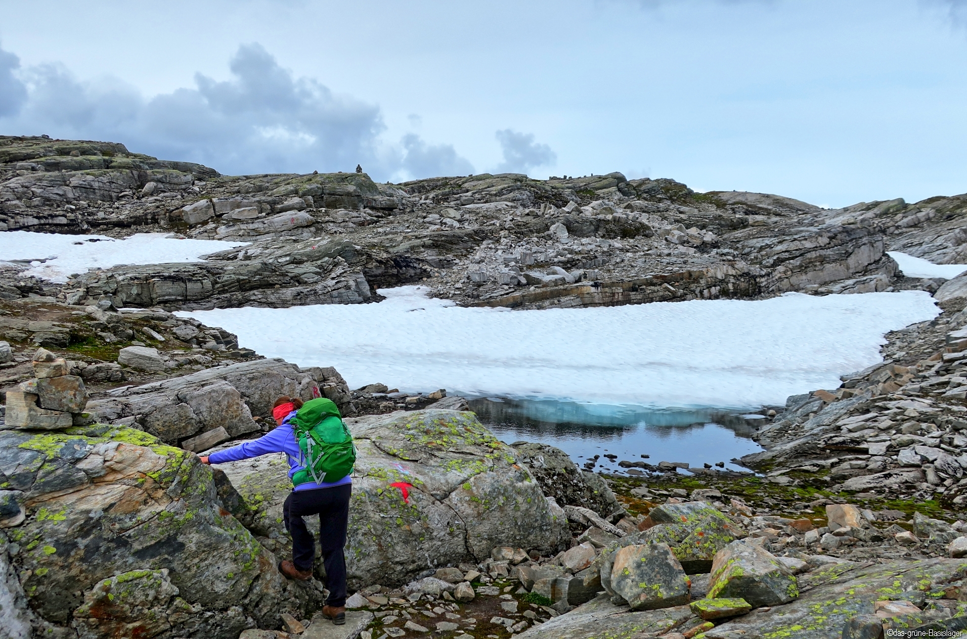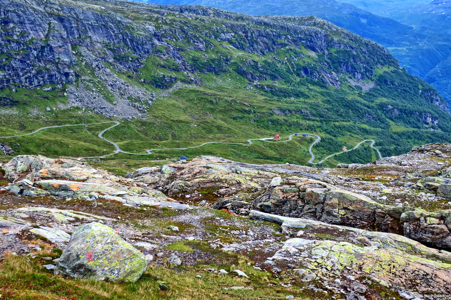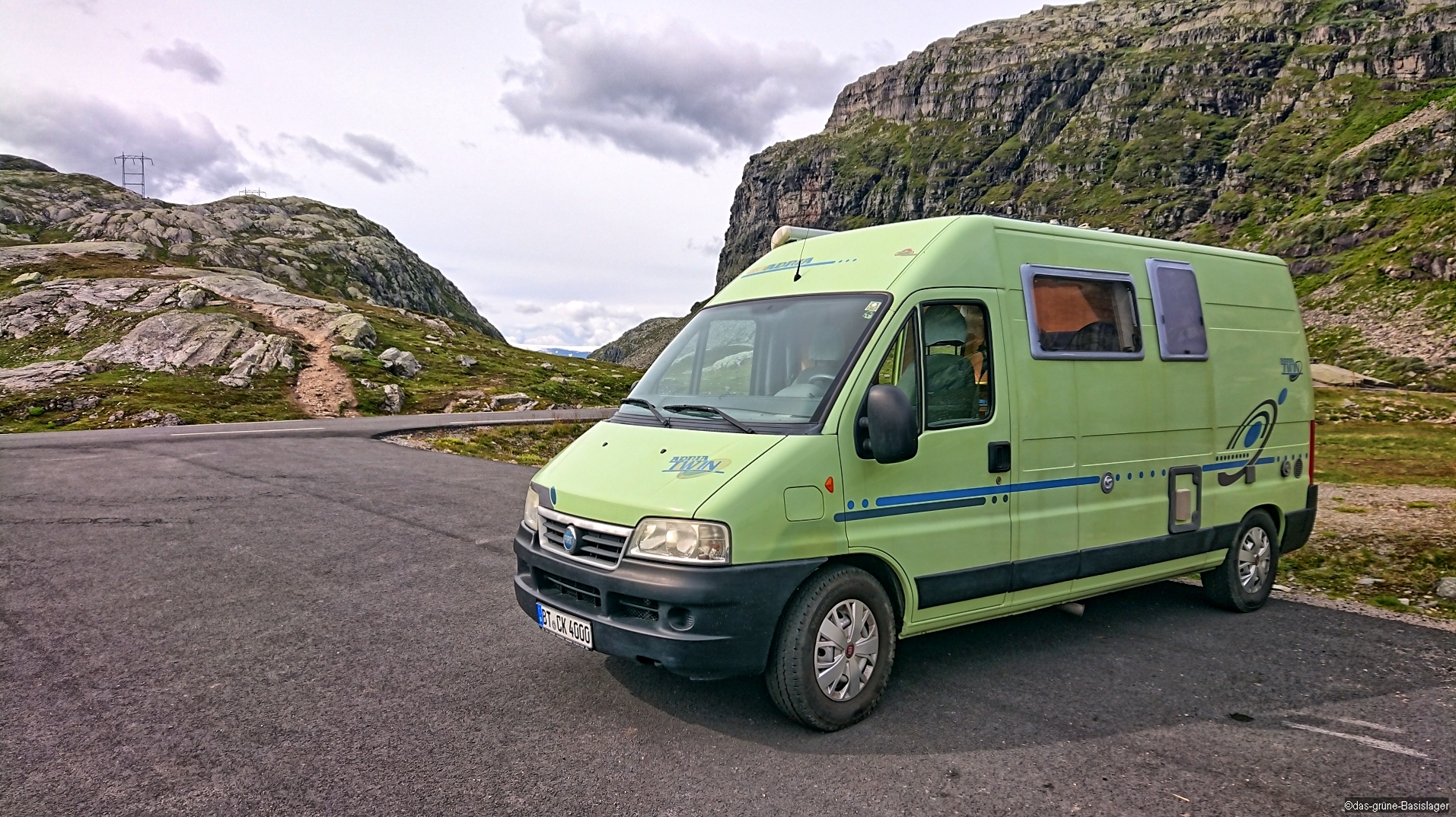 Unsere Überlegungen für heute sind: wir machen noch eine schöne Tour in der Nähe vom Stellplatz und siedeln danach um auf einen neuen Übernachtungsplatz. Für Nachmittags / Abend ist nämlich auch hier Regen angekündigt. Die Wahl trifft auf die Rundtour Hallet grøne, die an der alten Straße E134 (mittlerweile gibt es einen Tunnel) am Ullshaug startet. Die Straße beginnt mit der Einschränkung auf 2m Breite und ist sehr kurvenreich und steil. …schon spannend 🙂