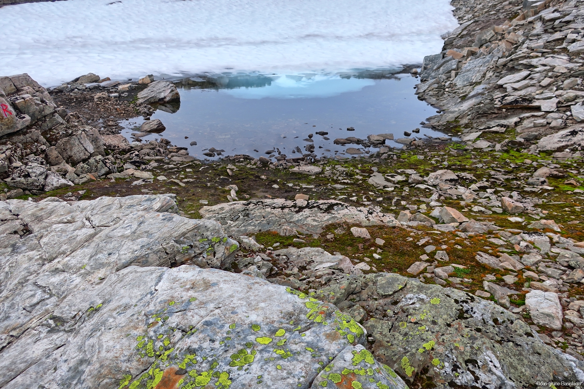 Ein Schneefeld will überquert werden und eine ausgesetzte Passage ist auch dabei