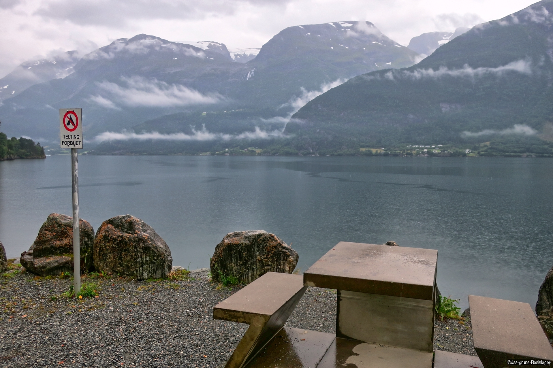 Wir setzen bei Oppedal mit der Fähre über auf Lavik und stehen nun auf dem ca. 15 km entfernten Rastplatz neben der E39.