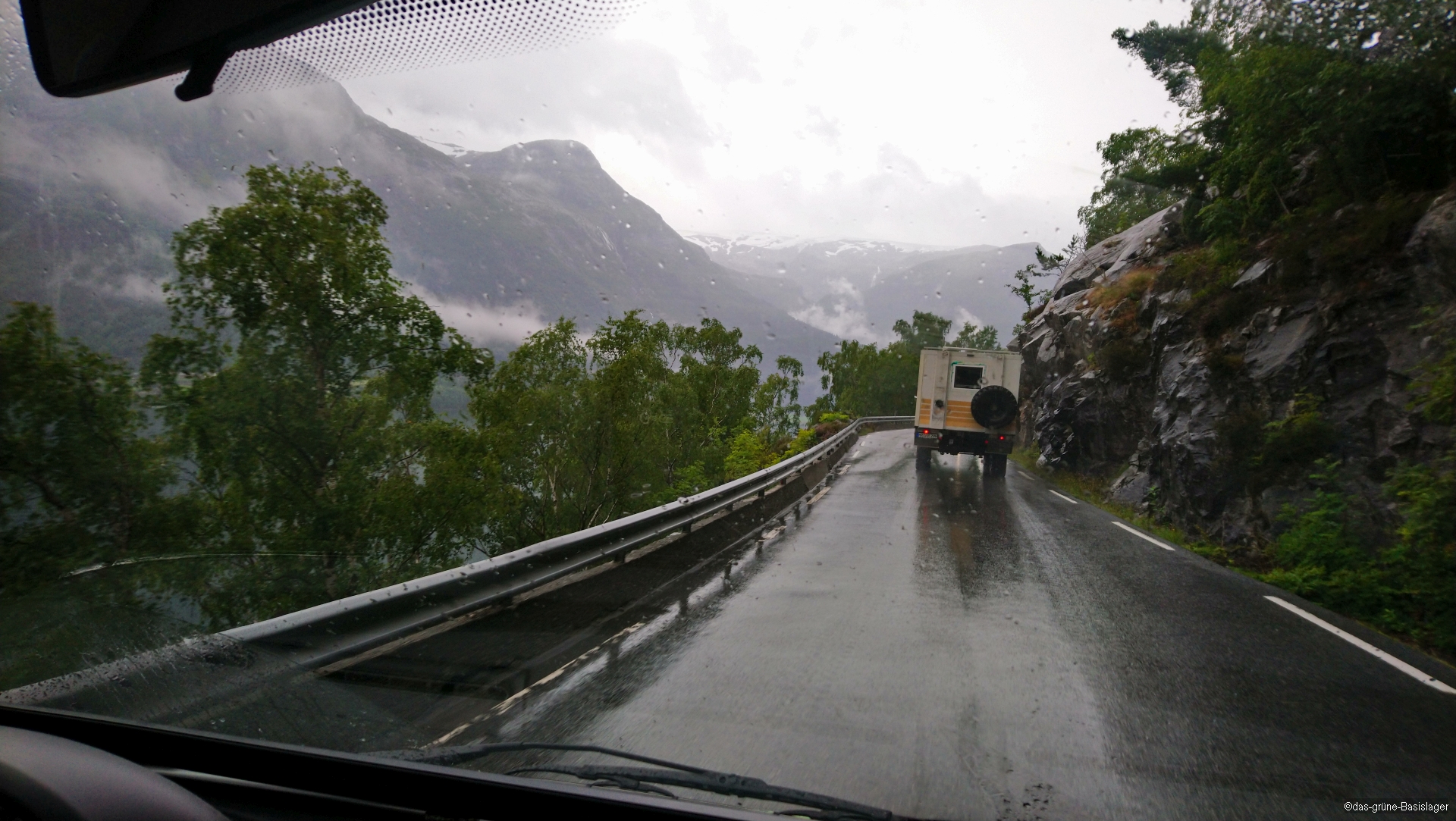 Die Wettervorhersage hatte recht. In der Nacht hat es zu regnen begonnen und ringsherum ist nur graue Suppe. Die Abfahrt auf der engen und kurvenreichen alten E134 ist eher ein vorsichtiges hinabtasten. Auf der eigentlichen E134 geht es dann zügiger voran. Wir fahren auf ihr bis Skare, dann weiter auf der E13 bis nach Brimnes die E7 Richtung Bergen abzweigt.