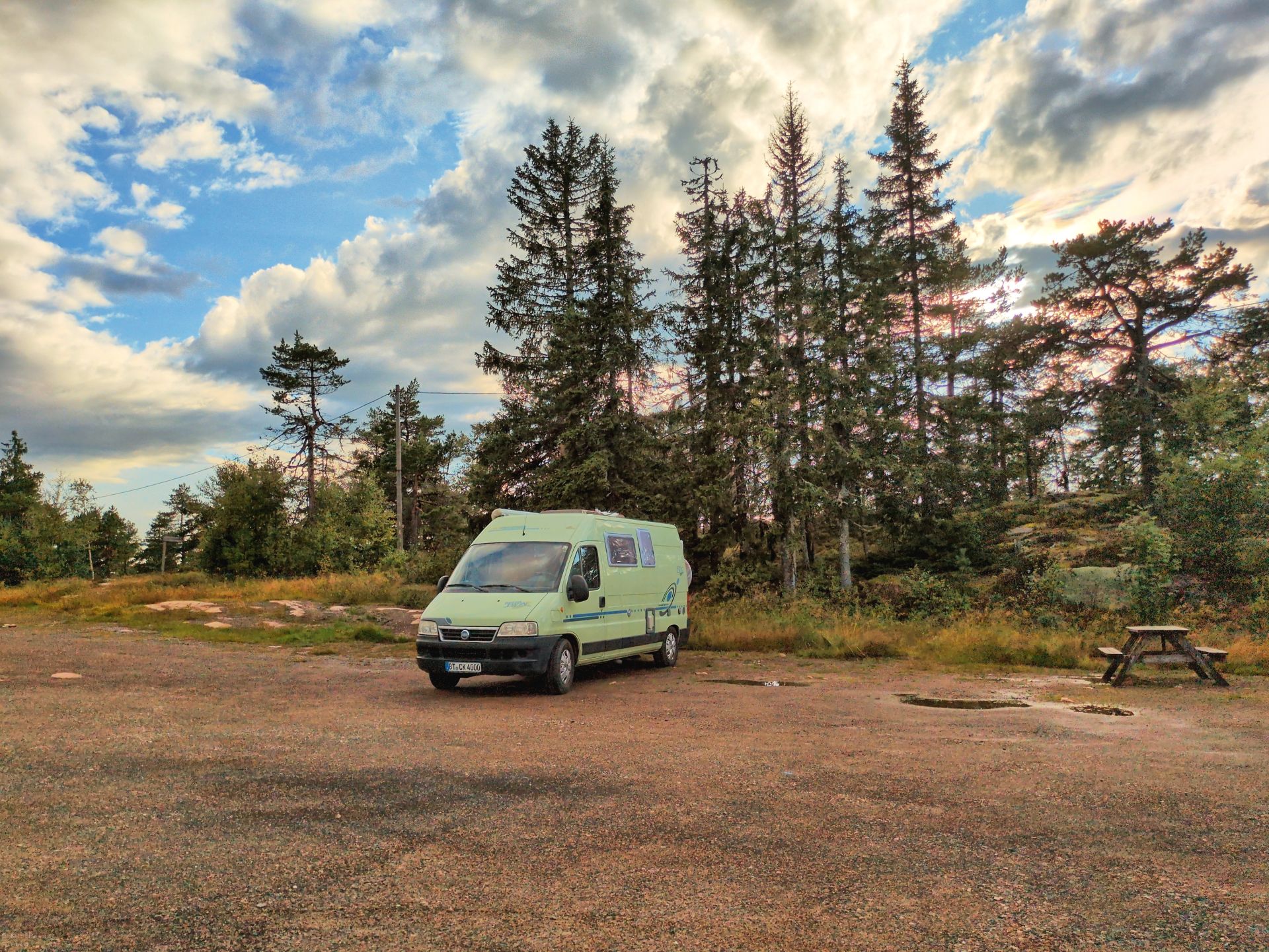 Nach dem Frühstück (bei Sonnenschein) entscheiden wir uns, dass wir ohne eine kurze Runde zu gehen, gleich unsere Weiterreise antreten. Wir fahren auf der E45 am westlichen Rand des Vänern-See hoch, fast bis Karlstadt. Dann geht es noch immer auf der E45 an den 3 langgestreckten Fryken-Seen hoch bis Torsby. Die Fahrt ist recht langwierig, da die Höchstgeschwindigkeit meist zwischen 70 und 90 km/h begrenzt ist.