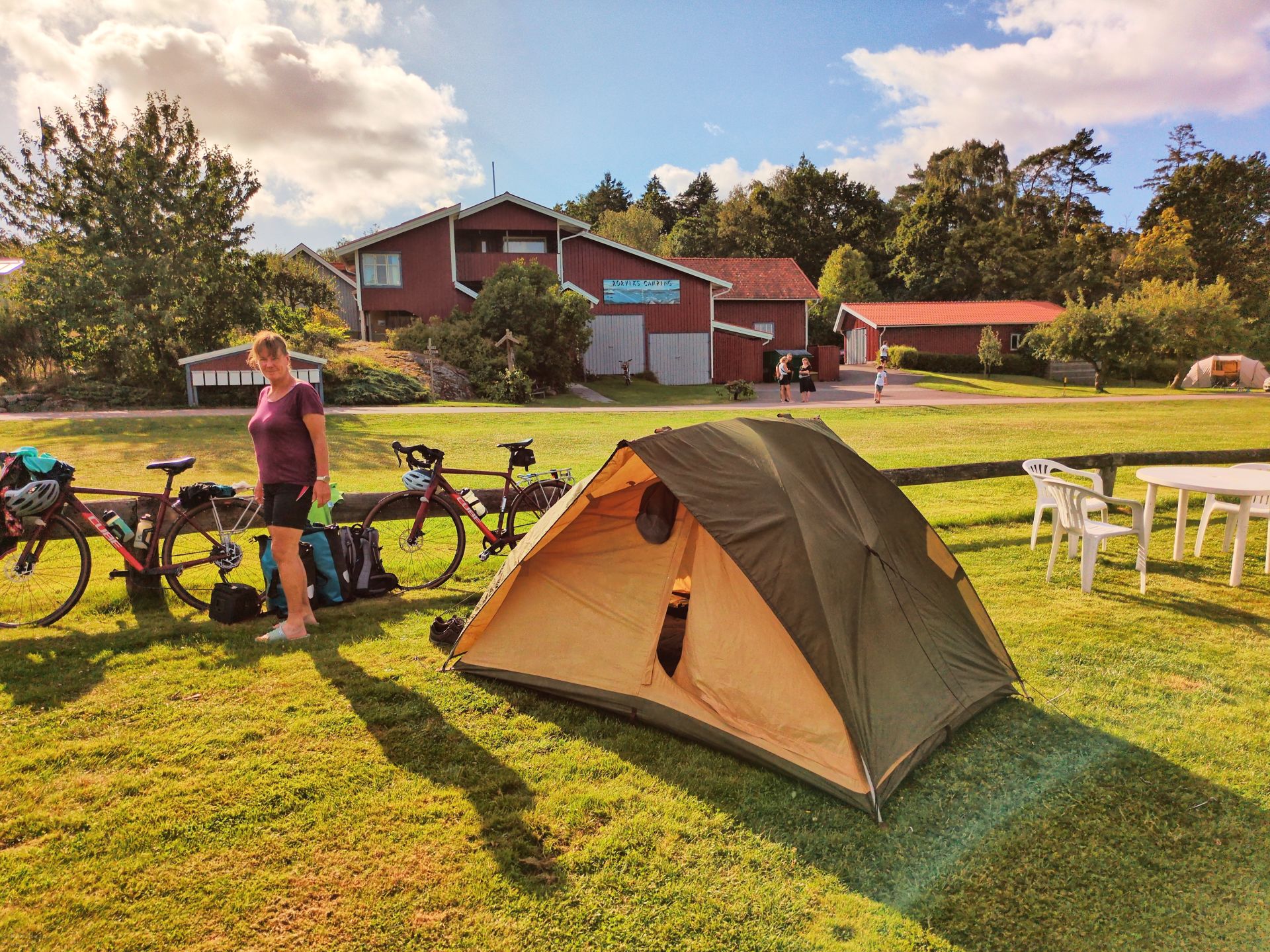 Nach dieser Stärkung fahren wir nur noch ca. 20 km bis zum Campingplatz in Rörvik bei Västra Hagen. Dem letztmöglichen vor Göteborg. Huch: ein Schild zeigt an “voll belegt!”. Aber die nette Betreiberin eilt herbei und klärt uns auf: für Bikepacker ist immer noch Platz!